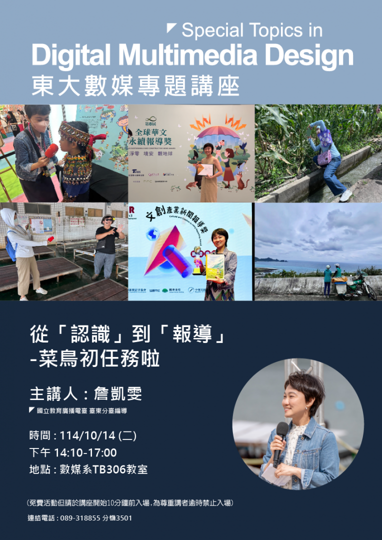 【專題講座】從「認識」到「報導」-菜鳥初任務啦 eidm 3 10 月, 2025 3 10 月, 2025 專題講座 / 最新消息 主講人 : 詹凱雯(國立教育廣播電臺 臺東分臺編導)時間 :114/10/04(二) 14:10- 17:00地點 : 師院學院TB306