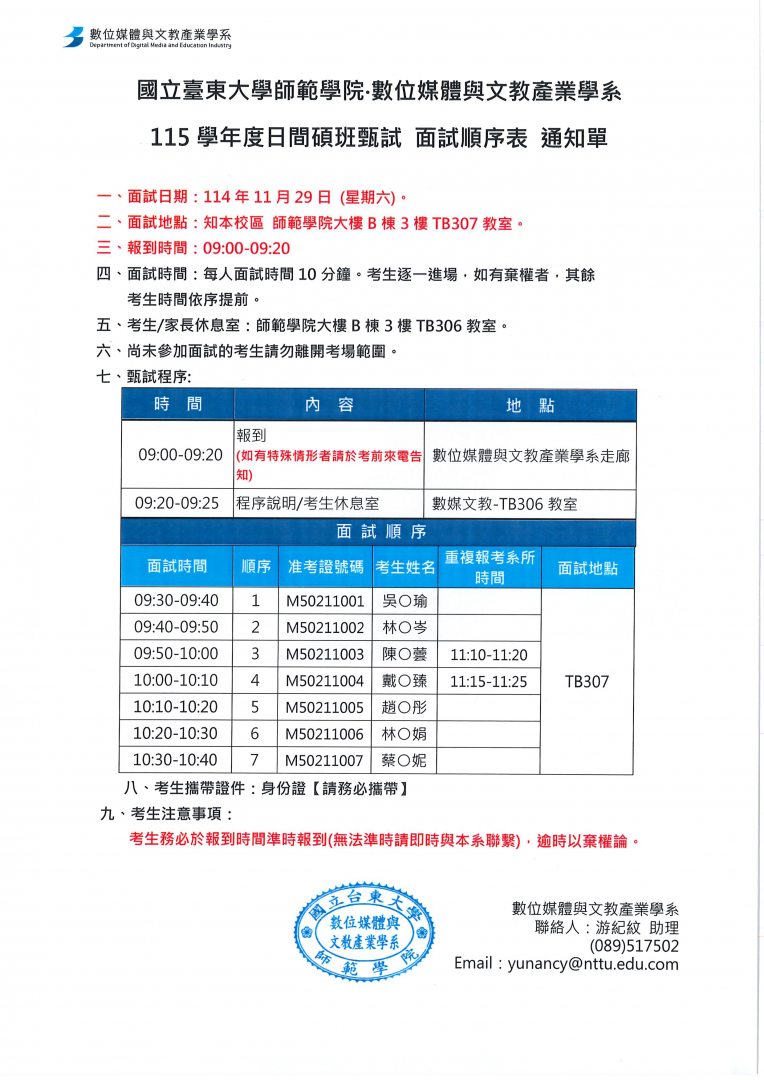 Home 招生資訊 115學年度日間碩班甄試面試順序表_通知單