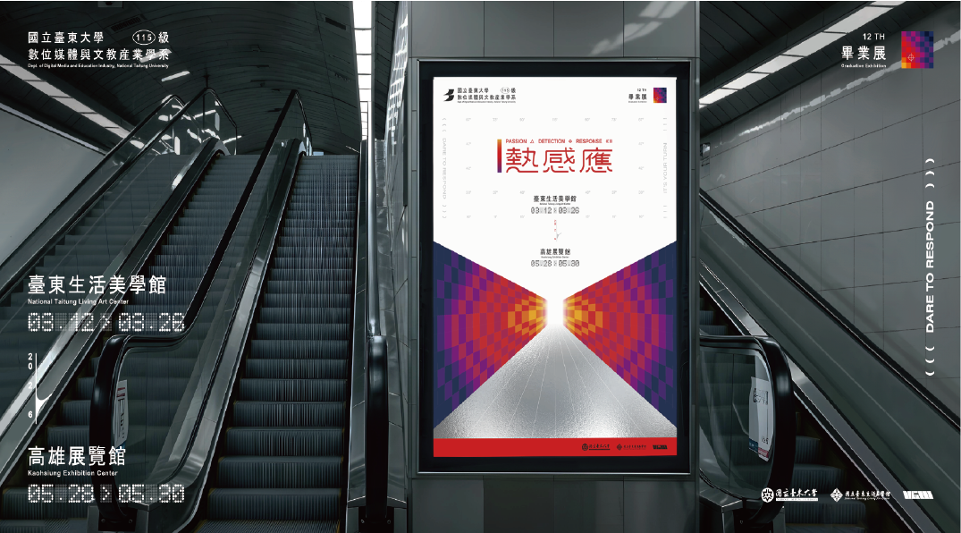 畢業展覽 第十二屆-熱感應 「熱感應」以「熱情、感知、回應」三個主要關鍵詞,熱情驅動我們去感受、感知,最後以創作做出回應。 第十一屆-邊界輸出中 數位中樞,邊界輸出!(ノ゚0゚)ノ~以「浪」為主題,結合不同形式的浪,如山是浪、海浪、稻浪與數位浪潮,展現方向感與邊界的延伸與輸出 ➠➠ 第十屆-伏特⁺ 能量無所不在 .ᐟ.ᐟ▆ ▅ ▃ ▂_ ᴘᴏᴡᴇʀ ᴜᴘ .ᐟ.ᐟ _▂ ▃ ▅ ▆ 第九屆-東感光波 靈感化為泡泡🫧,形塑出多樣的型態凝聚成一波浪潮,反射東部的能量。 第八屆-引擎發東 思維的爆震經過不斷打磨與淬鍊創造出屬於你我之間的合作與對話 引擎的發動始於東—引擎發東。 第七屆-指差確認 每個車窗都是我們的作品與外界乘客的連結當作品做好了最後準備火車即將啟程,同時也是我們步入軌道的開始… 第六屆-陸續 每個人生都有一串神秘的程式碼,這是世代的傳承。是人們情感的聯繫,是靜靜蟄伏最後浪滔不絕。 第五屆-浮士德症候群 你們是在叫什麽叫?是有 浮士德症候群嗎?改造自我,只為孕育更好的作品,就如同為了追求更好,不惜付出代價的浮士德。 第四屆-東窗肆發 「東窗肆發」取諧音自成語「東窗事發」「東窗肆發」而中的「東」與大寫的「肆」,代表台東大學數媒系第四屆的意思。 第三屆-參數 參數,三亦可寫作“參”,最表層的意涵,意味著我們是第三屆畢業展覽。數,則可以連接“數媒系”。 第二屆畢業展-東物園 台東大學數媒系第二屆的畢業展主題為「東物園」。所有設計作品皆結合我們台東的在地特色,以各種台東文化產業特色為主。 第一屆-胎動 「胎動台東」蘊含「第一屆數位媒體與文教產業學系的學生將初試啼聲首屆也是首次代表本系至外縣市與他校參與聯展」。